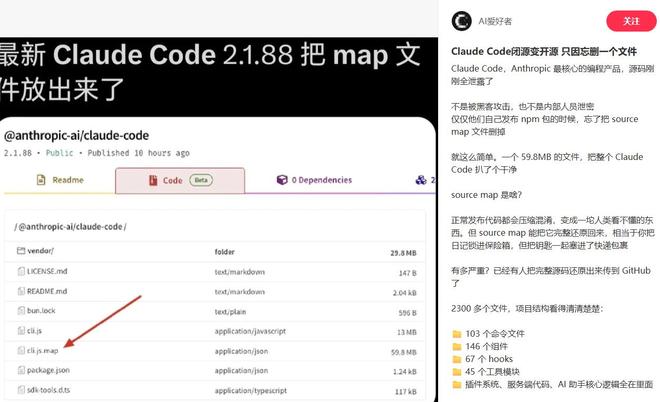 一位小红书博主“AI爱好者”写道:“Claude Code从闭源变为开源,只因发布npm包时忘记删除一个文件所致。”这不是黑客攻击或内部泄密事件,而是构建产物中多带了一个‘能反推源码关系’的映射文件。