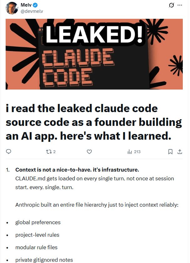 开发者@devmelv在X上分享了他对泄露源码的观察,他正在构建AI应用,并从中发现了几个值得注意的设计思路。