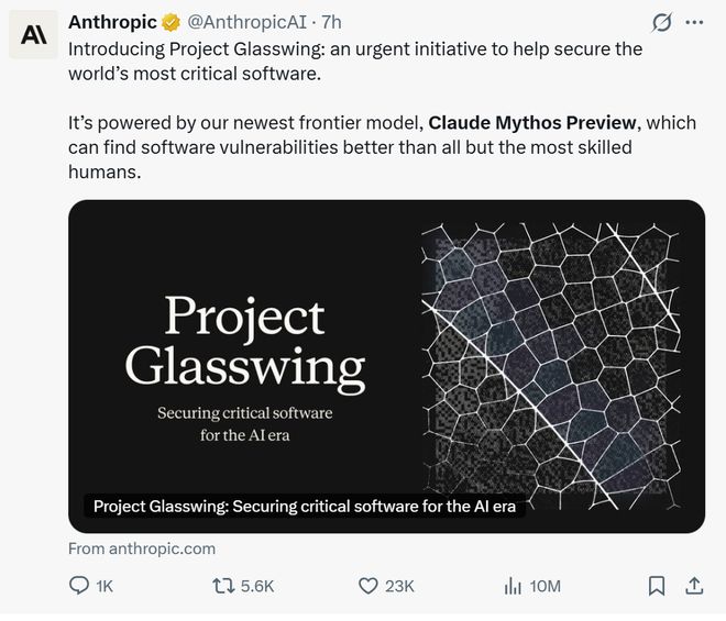 ▲Project Glasswing项目的社交媒体X平台推文由Anthropic发布