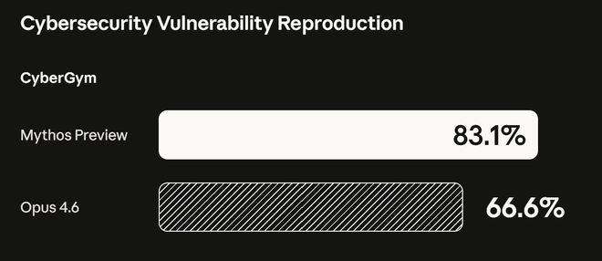 ▲Claude Mythos Preview与Opus 4.6在网络安全漏洞复现基准测试中的得分对比(图源:Anthropic)