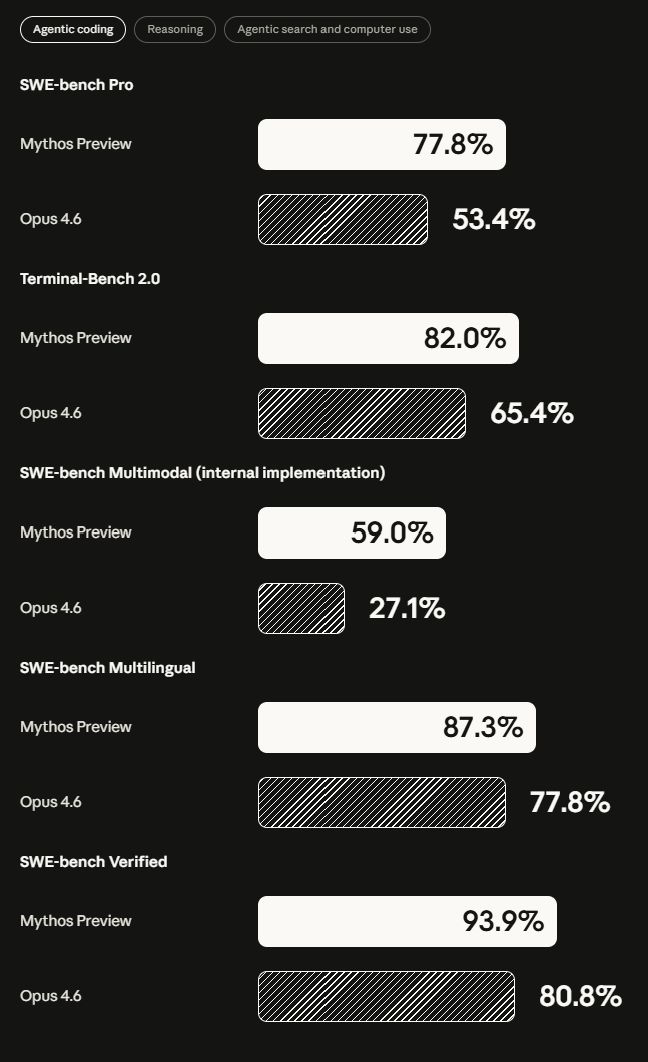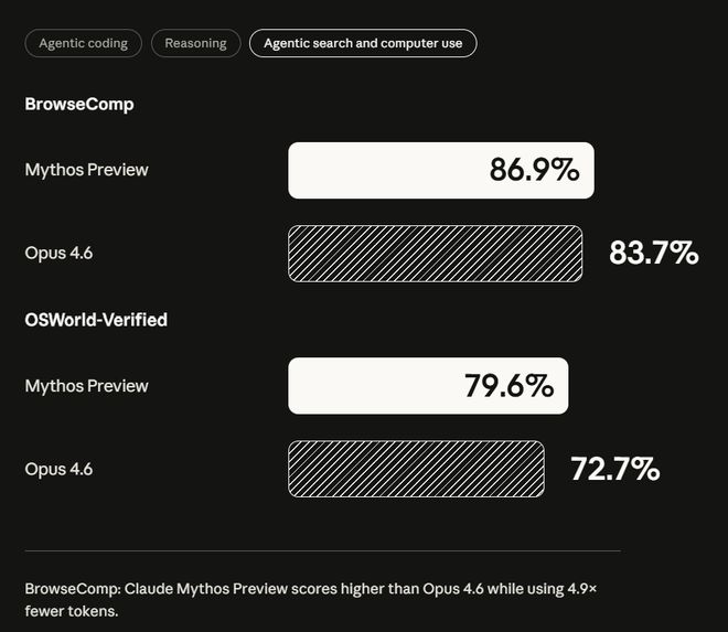 在专业漏洞复现测试CyberGym中,Mythos Preview得分达到了83.1%,而先前最强公开版本Opus 4.6的成绩为66.6%。此外,在衡量软件工程任务的SWE-bench Verified测试中,该模型同样表现出色,成绩为93.9%,相比之下Opus 4.6仅为80.8%。