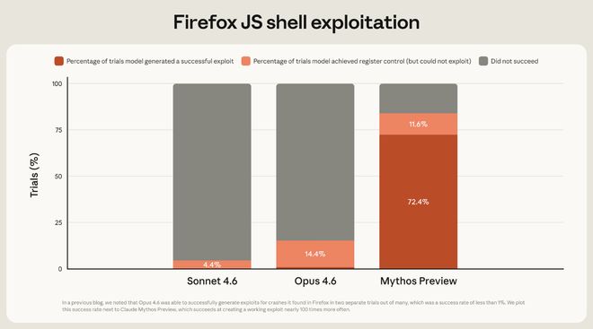 同时,Anthropic还发布了Mythos Preview在Firefox JS shell环境下的漏洞利用测试结果。数据显示,在这一场景下,新模型成功生成完整可利用exploit(漏洞利用代码)的比例高达72.4%,另有11.6%的测试实现了寄存器控制;而前代模型Opus 4.6在此类任务中的成功率不足1%,这表明Mythos Preview在漏洞利用能力方面提升了近80倍。