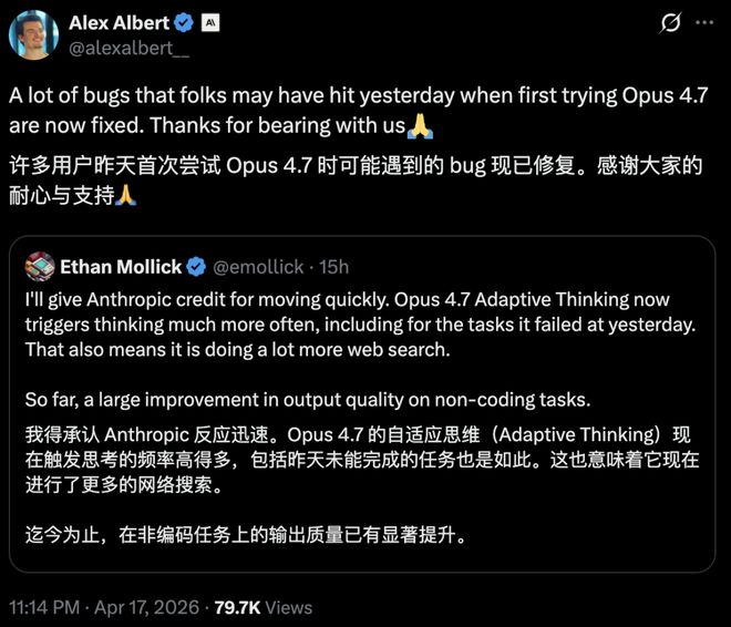 很多人在昨天刚开始体验Opus 4.7时可能遇到的bug,现在都已经修复了。感谢大家的包容和耐心。