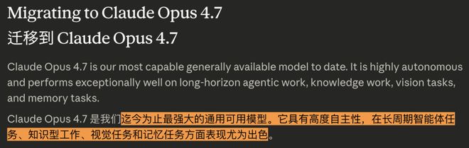 Anthropic在官方迁移指南中指出,Opus 4.7 相比4.6存在若干行为变化,同时也强调,Opus 4.7仍是其当前综合能力最强的通用可用模型,在长周期智能体任务、知识型工作、视觉任务和记忆任务方面表现尤为出色。