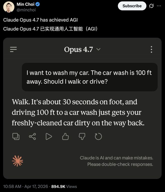 还有网友说,Claude Opus 4.7 已实现通用人工智能(AGI)。