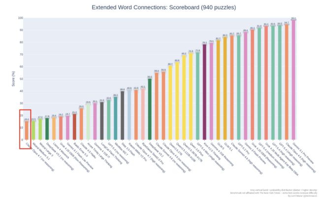 GitHub上的NYT Connections Extended基准测试也给出了顶级排名。