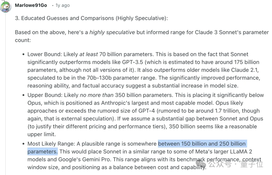 在对Claude 3 Sonnet参数规模的推测中,Reddit社区中的讨论持续不断,有人通过性能数据推算出其参数量可能在150-250B之间。