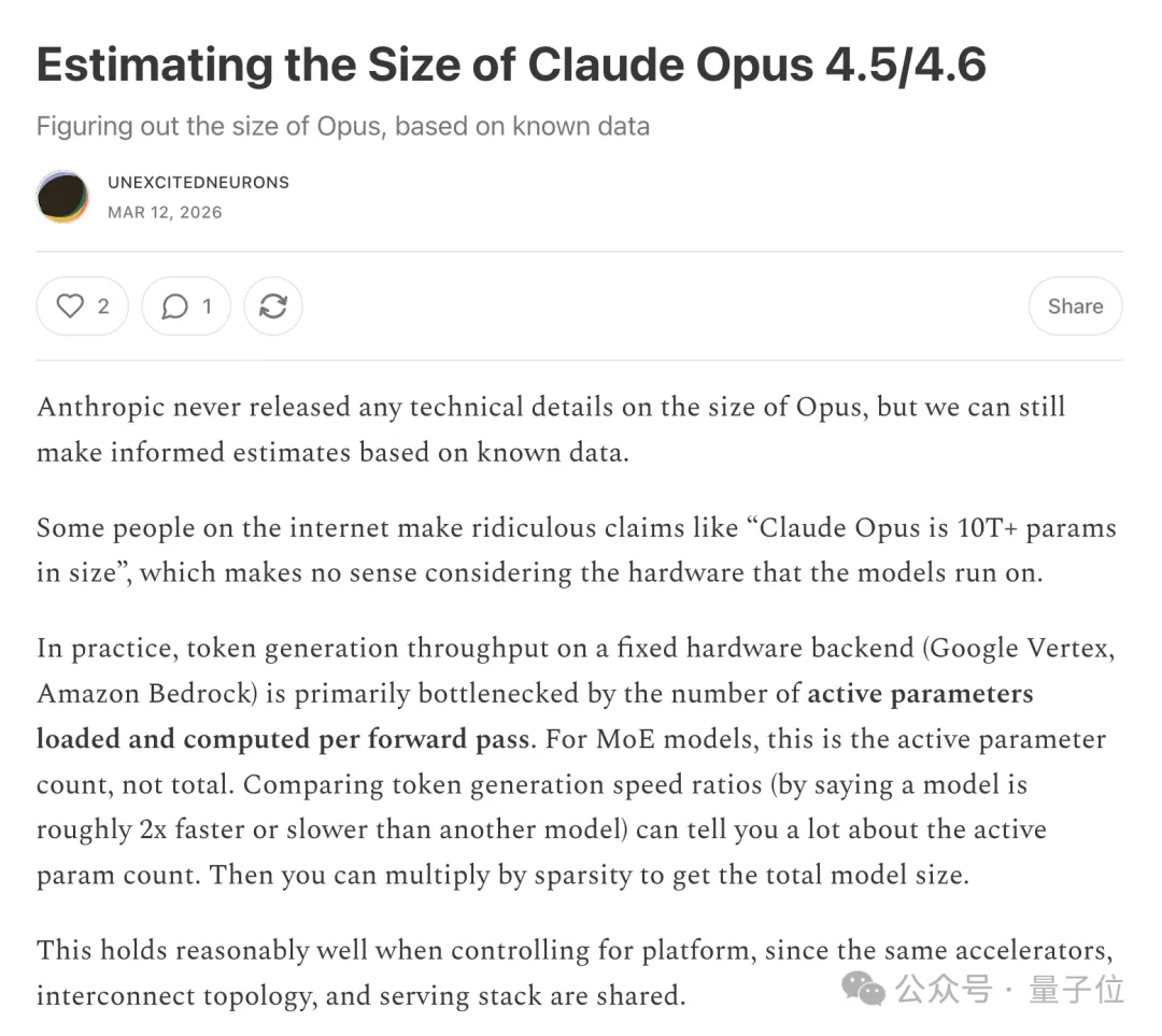 最近,一篇发表在Substack的技术逆向工程分析,通过OpenRouter在Google Vertex和Amazon Bedrock上的Token吞吐数据,估算了Claude Opus 4.5和4.6的激活参数量。