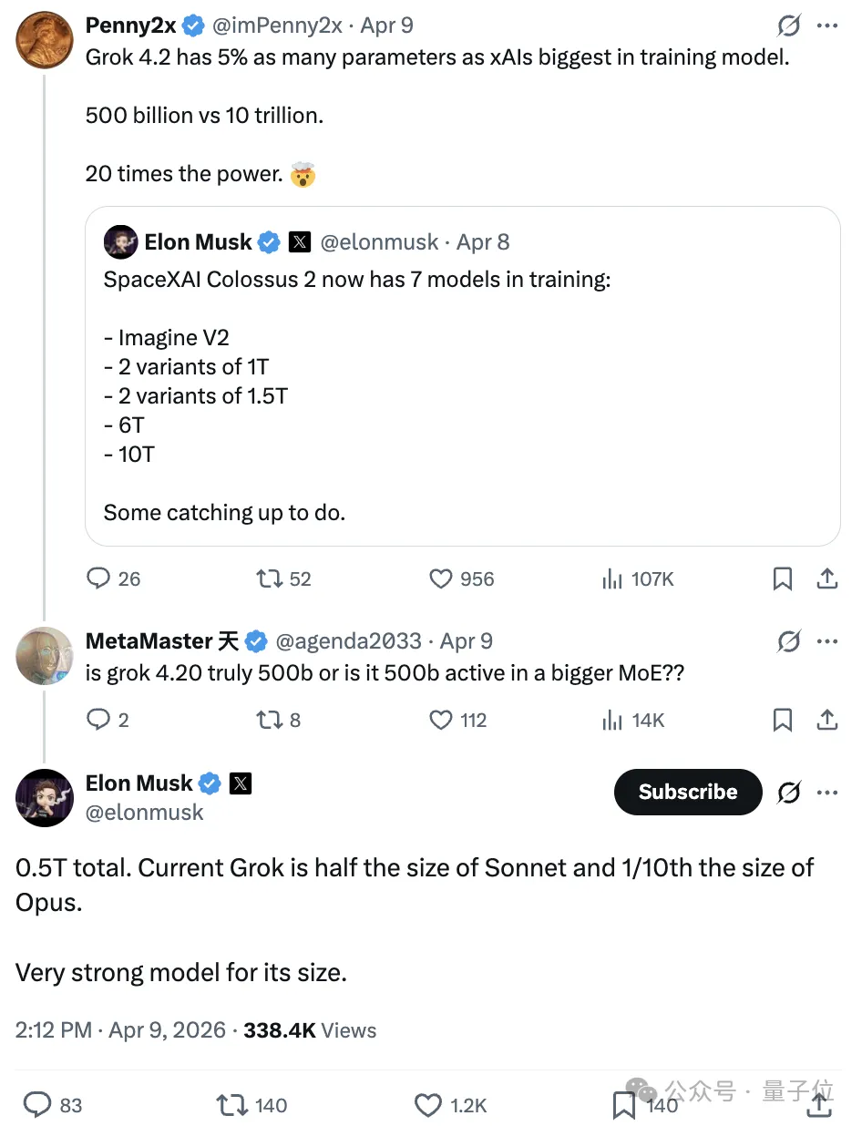 马斯克回应了关于Grok 4.2总参数量的问题,并确认该数值为0.5T即5000亿。同时他还提到Sonnet模型的参数规模是一倍半,Opus则是十倍于当前的Grok。