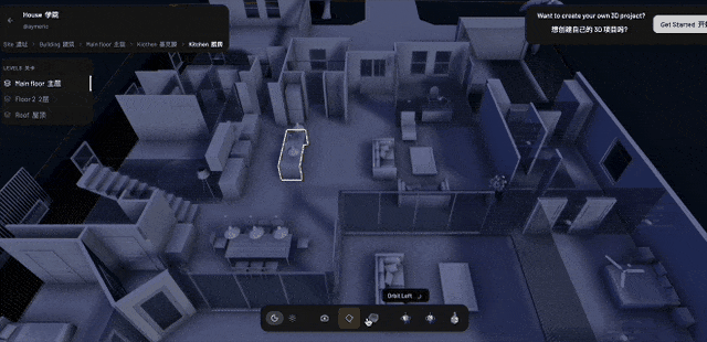 说的更直白一点就是,有了这一层支持之后,就算是搭一个结构稍微复杂一点的别墅,拖墙体、切楼层、实时渲染这些操作,也几乎不存在啥卡顿问题,整体体验会更接近本地软件一点。