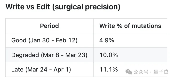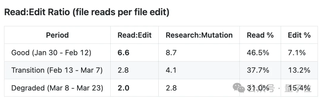 在1月30日至2月12日的“优质期”,Claude Code修改代码,读改比能达到6.6,工作流遵循“先研究再修改”(先读取目标文件、相关依赖文件,检索代码库全局调用关系,查阅头文件与测试用例,再开展精准修改)。