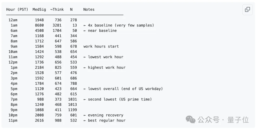 太平洋时间17:00是最差时段,中位估算思考深度降至423字符,是所有大样本量时段中的最低值。19:00是第二差时段,估算思考深度仅373字符,且样本量(1031个思考块)为全时段最高,属于美国黄金使用时段。