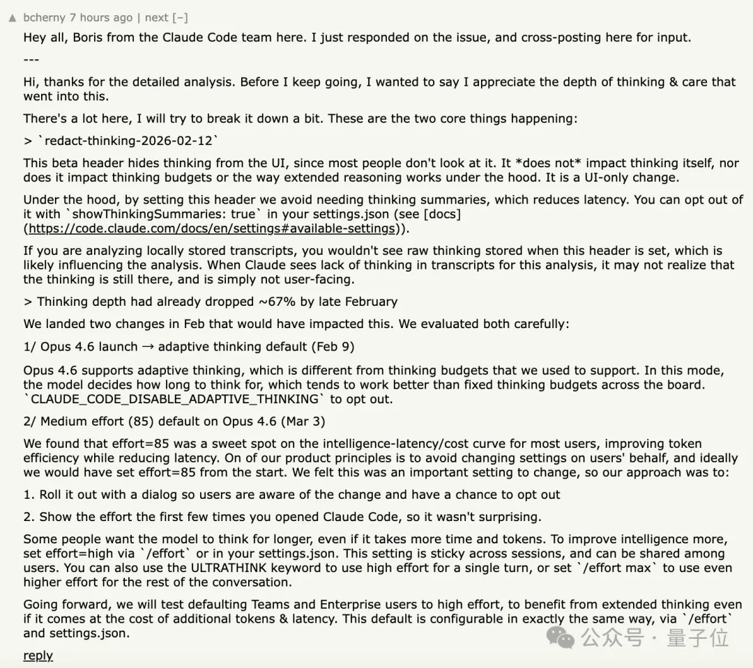 对于Claude Code思考深度在2月下旬下降67%,Boris表示他们确实在2月份进行了两项改动,可能对上述现象产生了影响。