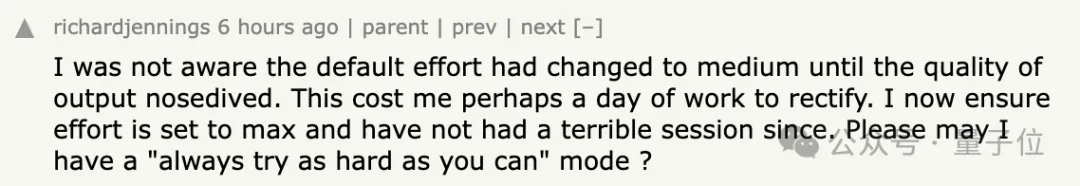在输出质量断崖式下跌之前,我完全不知道默认effort已经被改成了Medium。为了纠正这些问题,我大概花了一整天的工作时间。现在我会确保把effort设为最高,从那以后就再也没出现过糟糕的对话了。能否给我一个“永远拼尽全力”的模式?