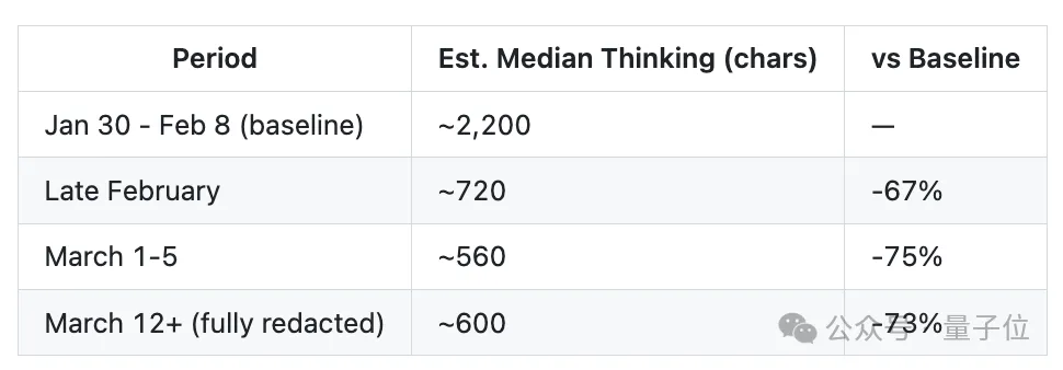 对比不同时间段的数据可知,1月30日至2月8日其思考深度约为2200字符,到2月下旬就暴跌至720字符,降幅达67%;3月上旬更是进一步缩水至560字符,下降75%。