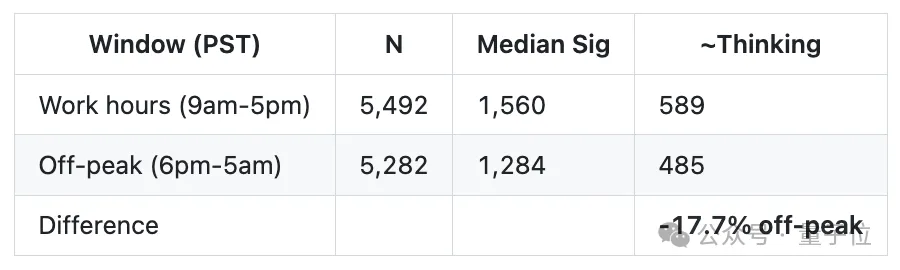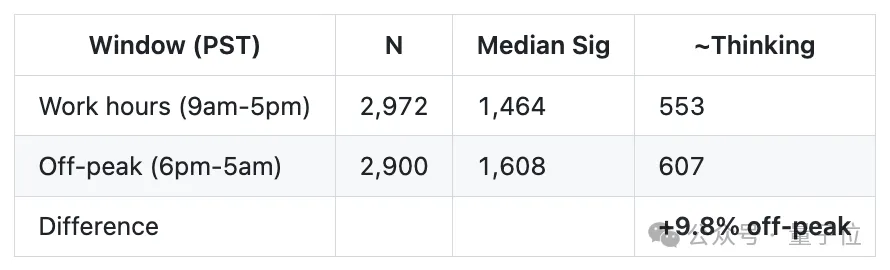 结果发现,在思考内容隐藏前(1月30日-3月7日),思考深度在全天相对稳定。非高峰时段仅存在约10%的小幅优势,符合负载略低的预期。