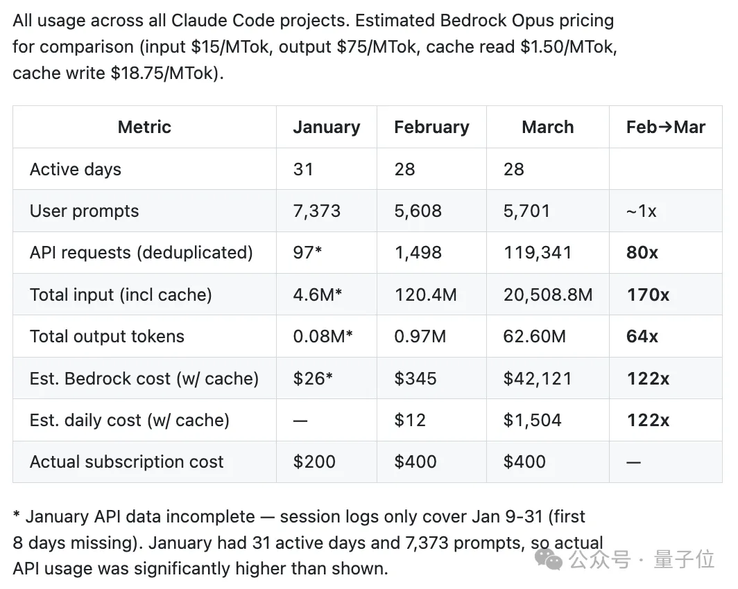 数据显示,2月到3月,用户提示词数量几乎没变,但API请求量暴涨80倍,总输入token涨了170倍,输出token涨了64倍,估算成本直接从345美元飙升到42121美元,暴涨122倍。