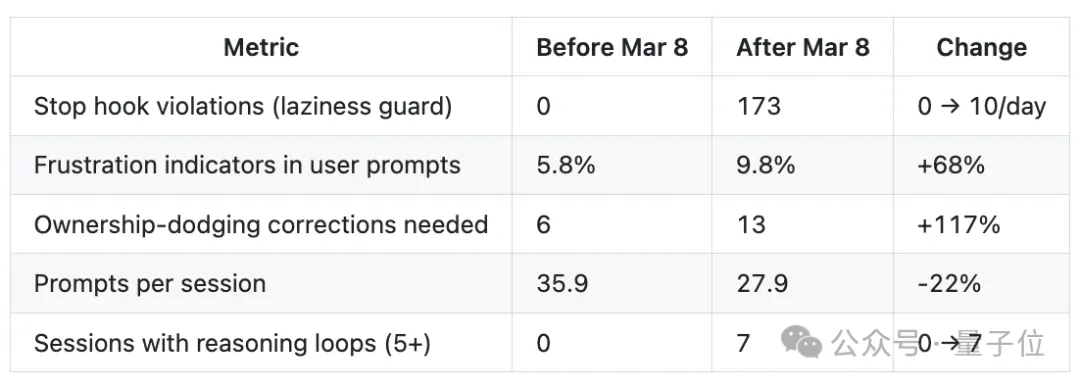 用户提示词中的负面情绪占比从5.8%升至9.8%,涨幅68%;需纠正的推诿行为数量翻倍,单会话平均提示词数量下降22%,甚至出现了此前从未有过的推理循环问题。