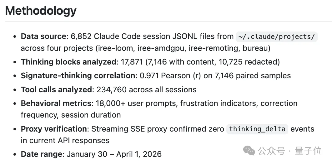 所有分析基于~/.claude/projects/目录下4个项目(iree-loom、iree-amdgpu、iree-remoting、bureau)的6852个Claude Code会话JSONL文件,覆盖17871个思考块(其中7146个包含完整内容,10725个已被隐藏)、234760次工具调用、18000+条用户提示词(涵盖负面情绪指标、纠错频率、会话时长),时间跨度从2026年1月底到4月初。