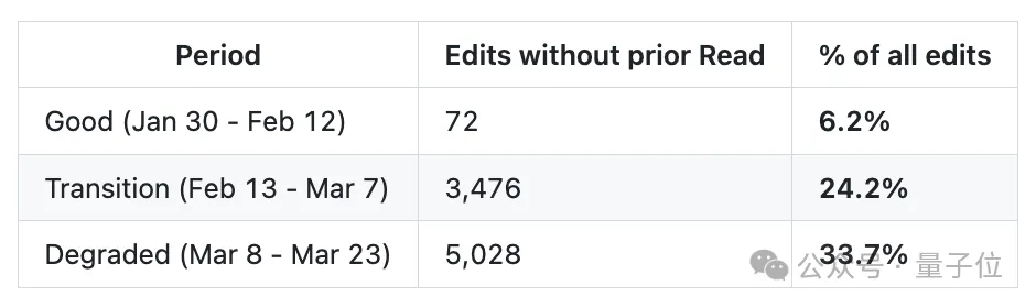 更详细的数据显示,退化期内,每3次修改中就有1次,是模型在未读取目标文件上下文的情况下直接进行的操作。