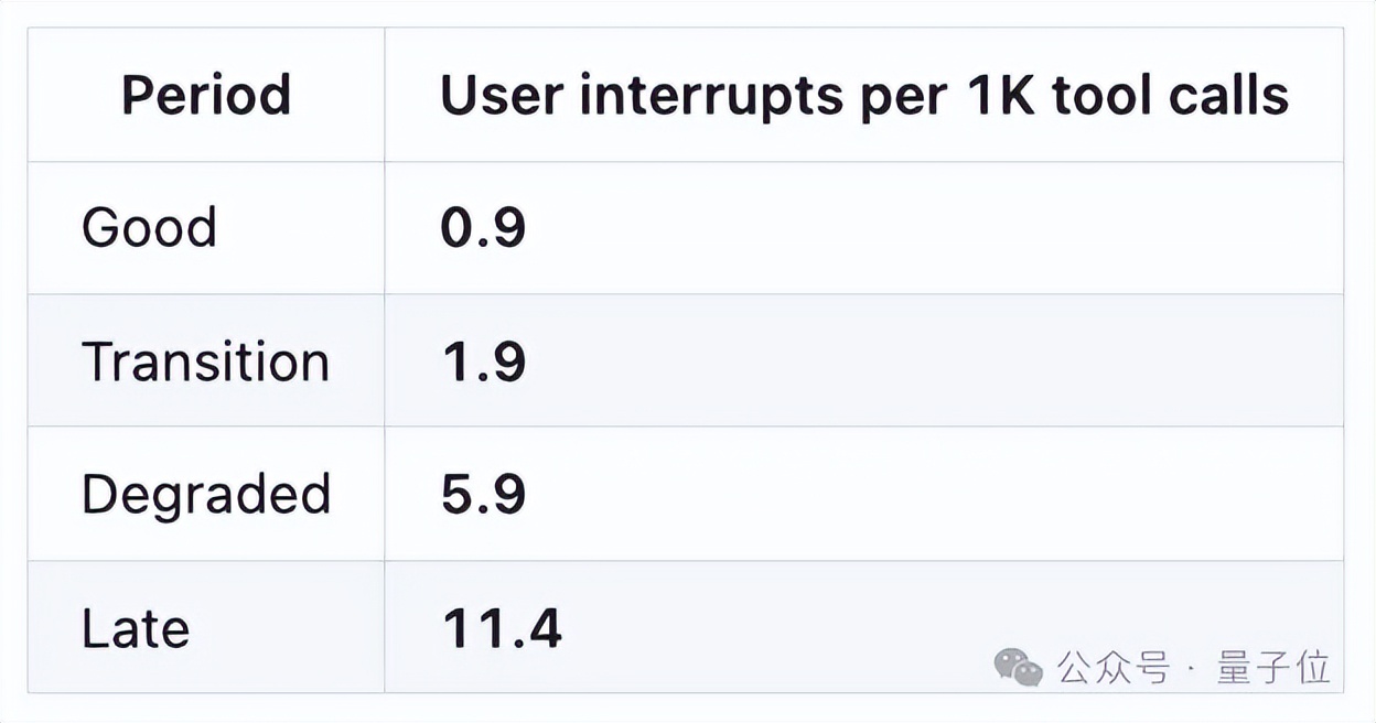 另外,用户中断也能说明很多问题,这意味着用户发现模型正在犯错并强行终止。中断率越高,代表需要的人工纠错越多。