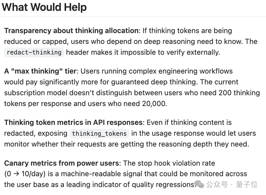 - 思考资源分配透明:如果思考token被削减或设置上限,依赖深度推理的用户有权知晓。redact-thinking头部配置,让用户无法从外部验证模型实际分配的推理深度。