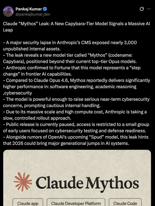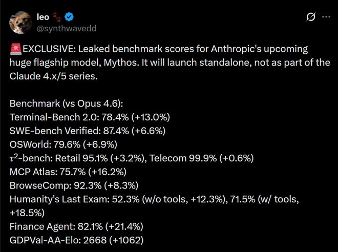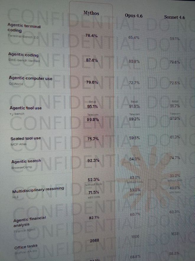 最新泄露的信息显示,疑似为Anthropic下一代旗舰产品Mythos的部分基准测试数据被意外公布。与之前Claude 4.x/5系列相比,这款模型被视为独立的产品线,并且定位更加高端。