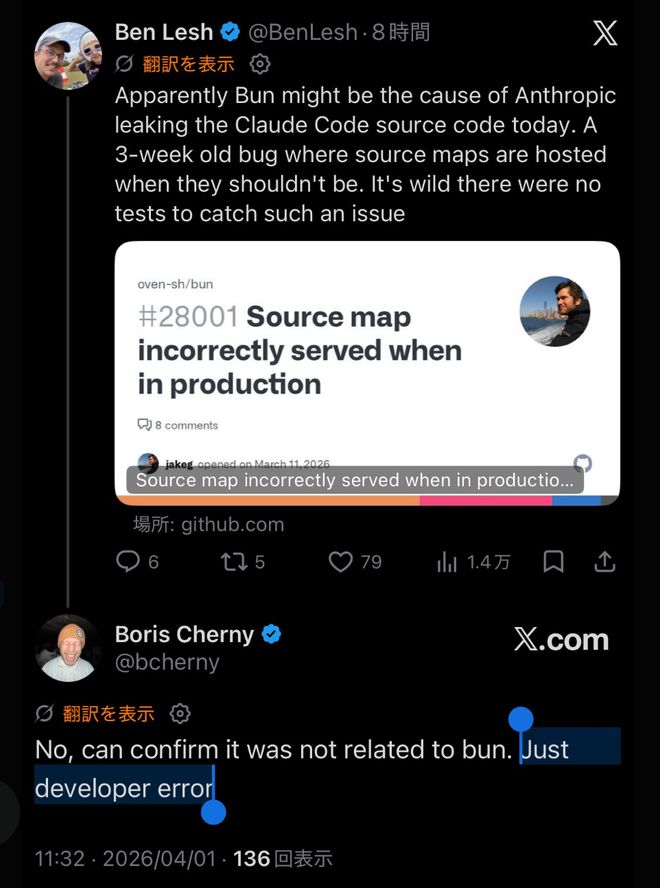 Anthropic解释称这是由于人为错误导致的发布打包问题。开发人员Boris Cherny对此轻描淡写地表示,这只是开发者犯下的错误而已。