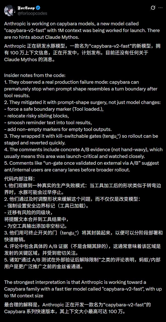 - 泄露的源代码中详细介绍了代号为capabara-v2-fast的新模型。该模型拥有1M Context的能力。