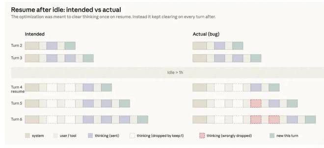 在三月尾声时,Anthropic 进行了一项改动以优化会话闲置期间的清理逻辑。然而这一改动却意外地触发了一个 Bug,导致每次对话都会清除之前的「思考」内容,让模型看起来像是「健忘且重复」。