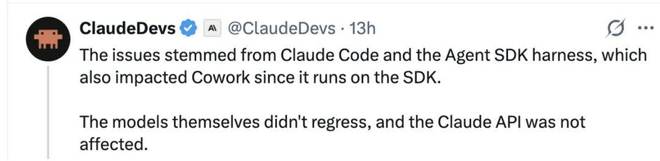 根据他们的解释,这些问题源于 Claude Code 和 Agent SDK 的运行框架(Harness),而 Cowork 也基于同样的 SDK 运行,因此同样受到了影响。「模型本身并没有退化,Claude API 则未受影响。」