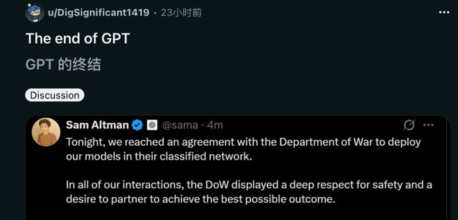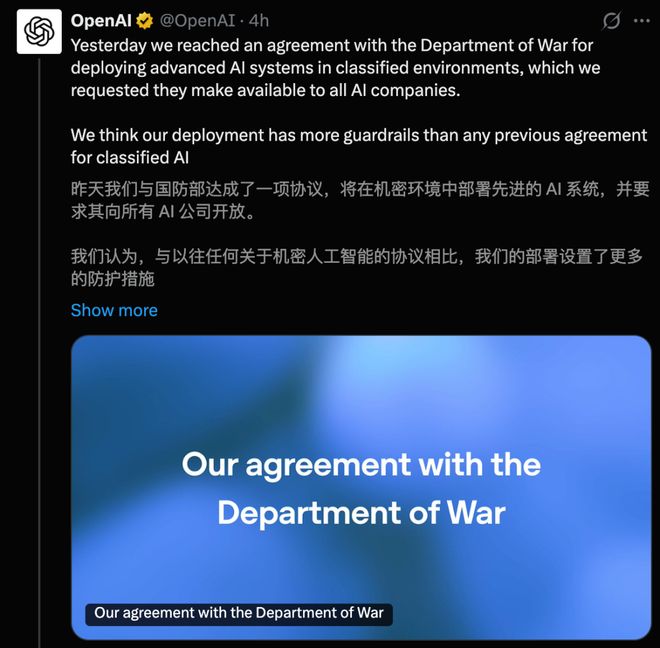 与此同时,Anthropic遭遇全面封杀之际,其竞争对手OpenAI迅速填补了空缺,并宣布与国防部达成协议。