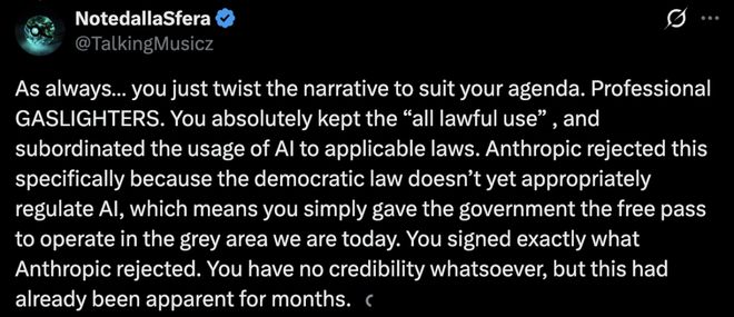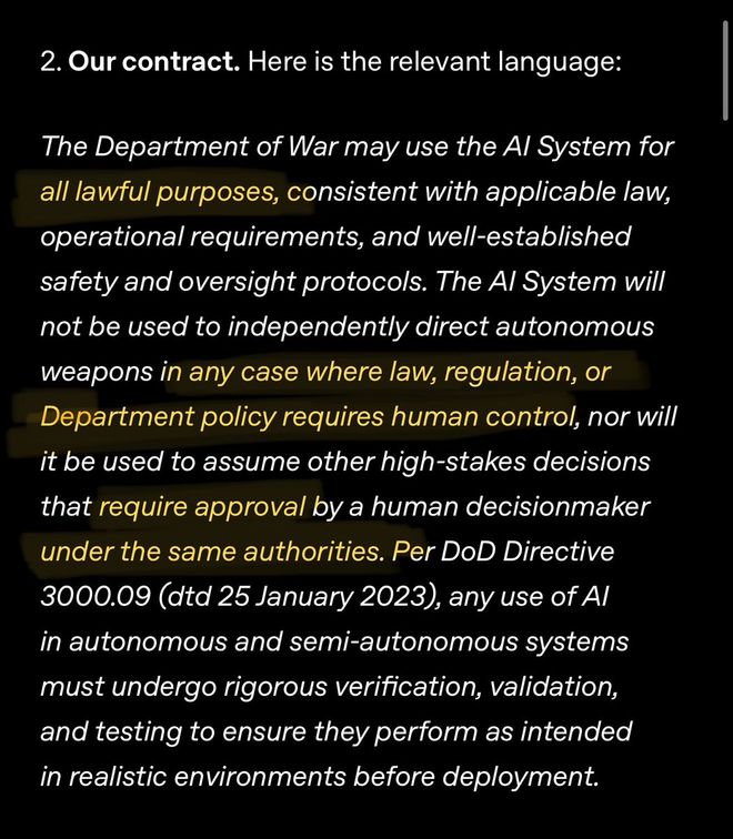 因为OpenAI确实保留了「所有合法使用」这一条款,并将AI的使用置于适用法律之下。 而Anthropic恰恰拒绝了这一点。