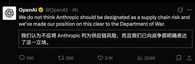 OpenAI也认为Anthropic被列为「供应链风险」,并不应该,明确向美国国防部表达了这一立场。