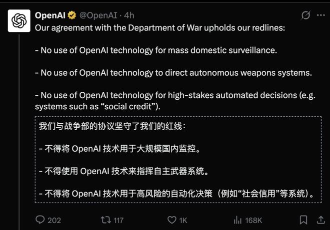 此外,OpenAI也曝光了与五角大楼的合同,证实了Anthropic所言非虚。