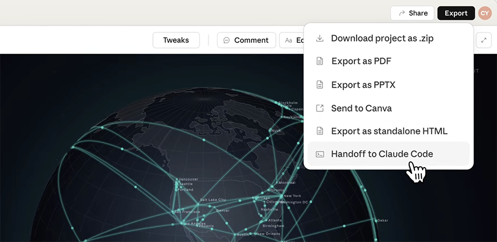 完成的设计作品可一键打包下载为压缩文件或者导出为PDF、PPTX以及HTML等不同格式,还可以发送给Canva或交给Claude Code生成代码。