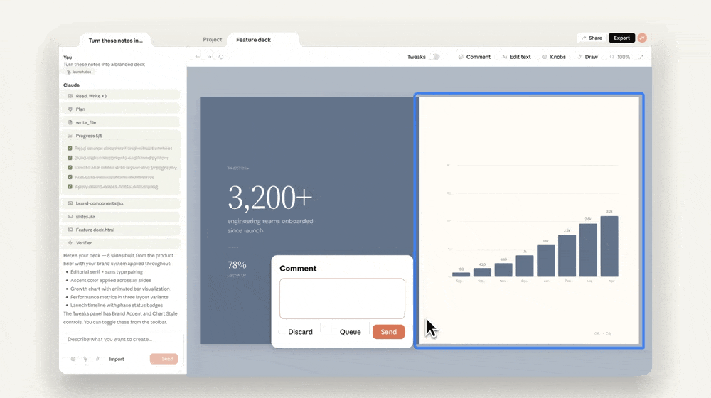 3、使用精细的控制功能进行微调。你可以直接对特定元素添加注释、编辑文本,或使用调整旋钮实时调整间距、颜色和布局。然后让Claude将你的更改应用到整个设计中。