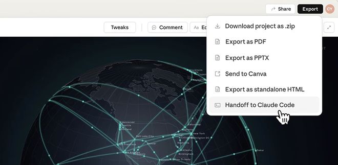 用户可以通过对话、内联评论或直接编辑等方式对生成的设计进行修改,同时支持将成果导出至Canva或其他格式保存,并可以一键打包发送给Claude Code以生成代码。