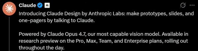 随着视觉能力更强的Opus 4.7模型的支持,Anthropic实验室团队顺利发布了Claude Design这款产品。