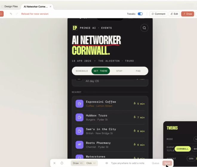 不过Claude发布的视频中,展现的修改功能和开发者实际体验有所不同,官方视频中共有Tweaks、Comment、Edit text、Knobs以及Draw这五个功能区,但在开发者实测中,Edit替代了Edit text和Knobs的位置。