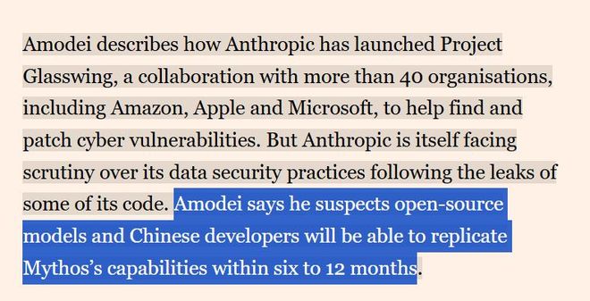 Amodei自己也承认,面对来自世界各地的竞争者,Anthropic可能只能领先几个月到一年时间。