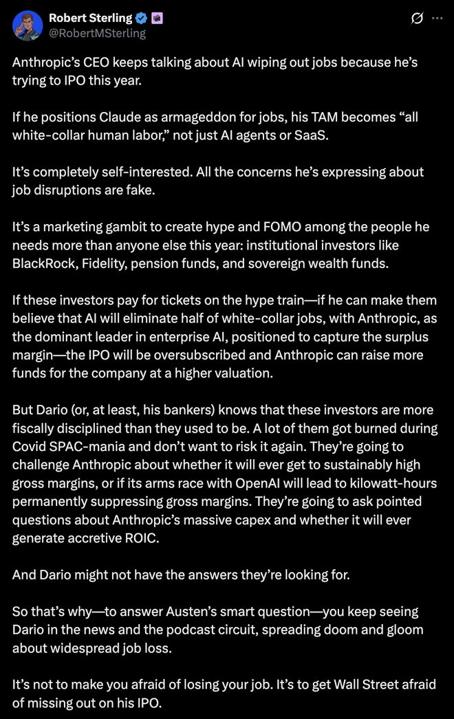 为什么Amodei要冒同行批评的风险,天天说“白领末日”?