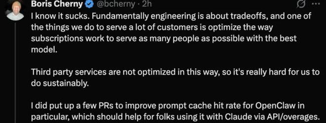 针对这种情况,Claude Code 的负责人 Boris Cherny 作出回应:“我们非常支持开源精神。实际上,我刚提交了一些旨在改进 OpenClaw 提示缓存效率的代码。这次政策调整更多是出于工程限制方面的考虑。”他还表示,“为了能让更多的用户享受我们的服务,我们将继续优化系统的性能。”