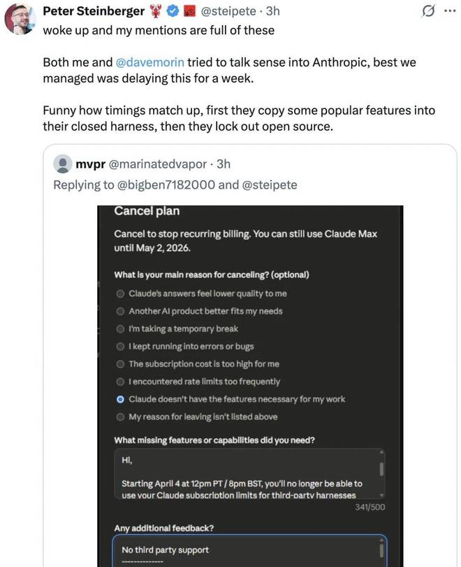 “我和 @davemorin 试图与Anthropic沟通,但只争取到了一周的延迟时间。讽刺的是,他们先是将社区受欢迎的功能复制到自己封闭系统中,然后又禁止了开源工具。”