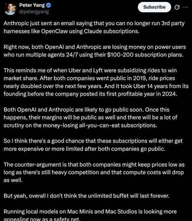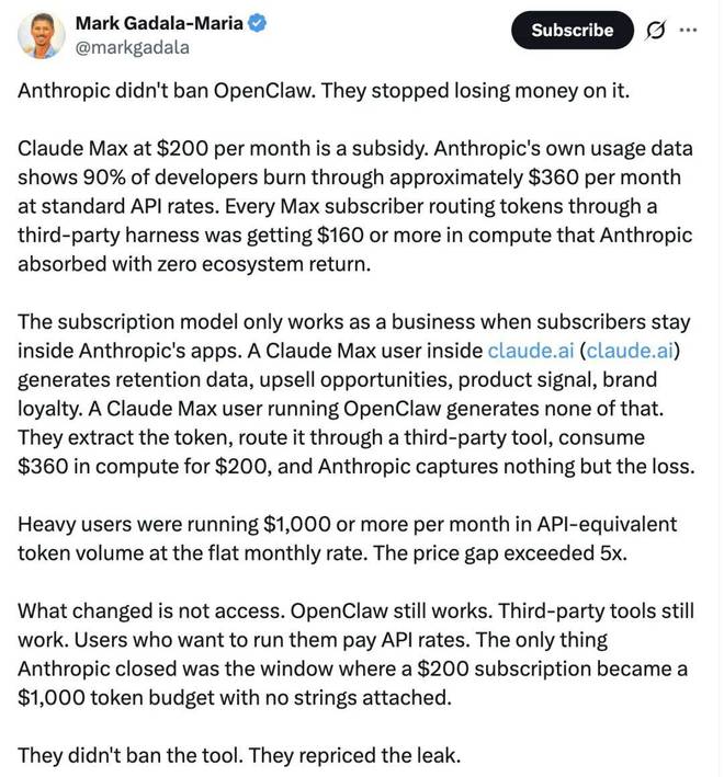 只有当用户在 Anthropic 自家应用内使用时,订阅模式才成立为健康的商业模式。比如一个在 Claude 官方网站上使用 Claude Max 的用户会留下数据、增加购买机会,并提供反馈信号和增强品牌粘性;但通过 OpenClaw 使用的用户则不会产生这些价值。