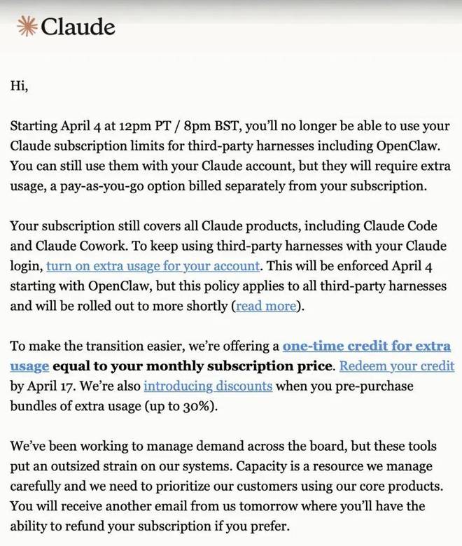 近日,许多使用 OpenClaw 的用户收到了来自 Anthropic 发送的一封邮件通知。邮件中提到,从太平洋时间4月4日上午12点开始,Claude订阅将不再包括对OpenClaw等第三方工具的支持。