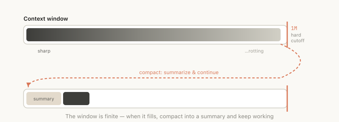 当上下文接近一百万token上限时,系统会自动进行压缩,但这恰好是问题最严重的时候。