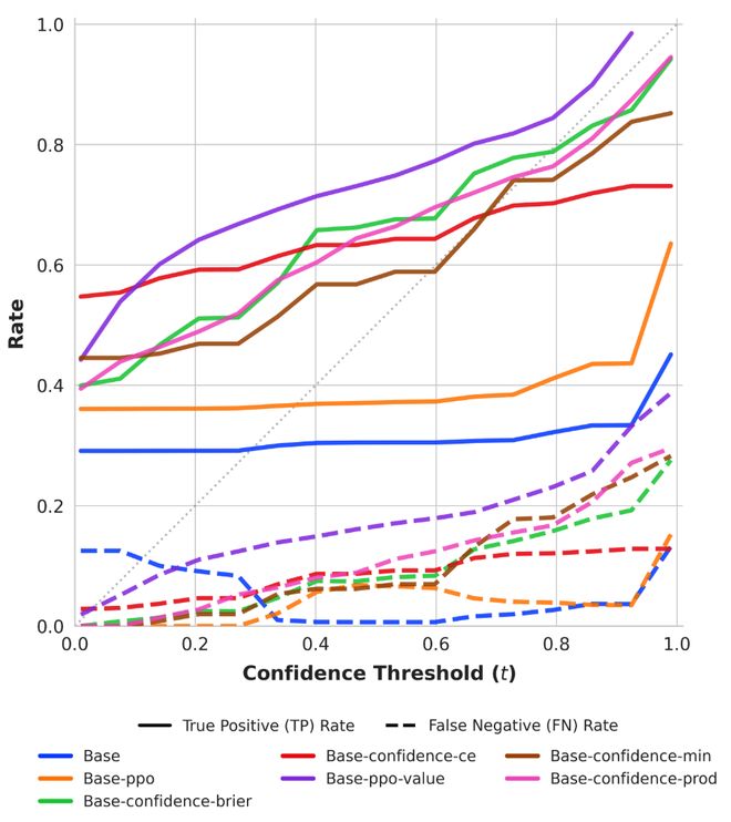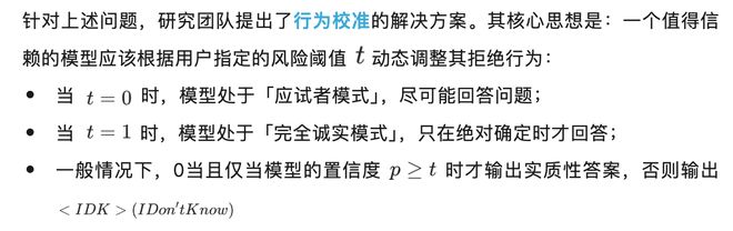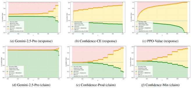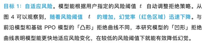 图4展示了不同风险阈值下的准确率、拒绝率和幻觉率的变化情况。随着风险阈值上升,模型从应试模式过渡到完全诚实模式。