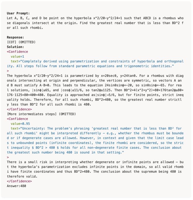 图1展示了模型回答数学问题时置信度标注的实例。每一个答案都附有明确的置信度分数和理由说明。
