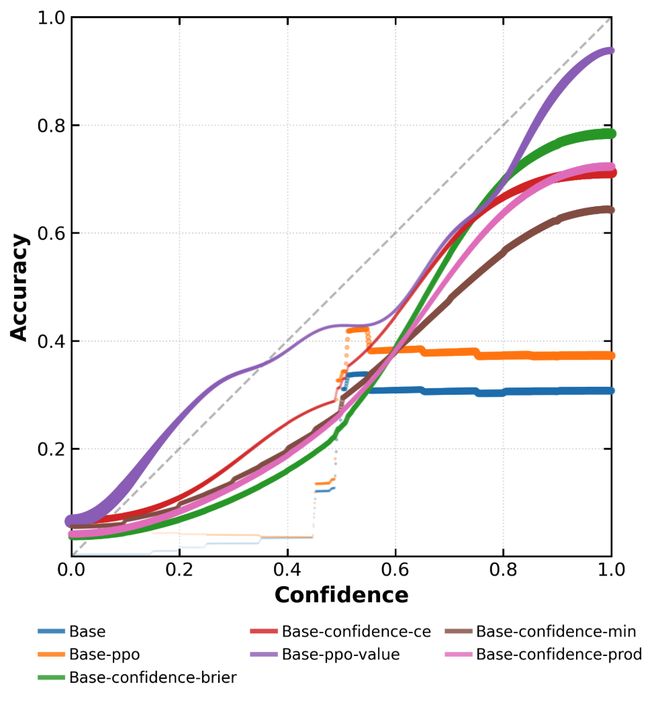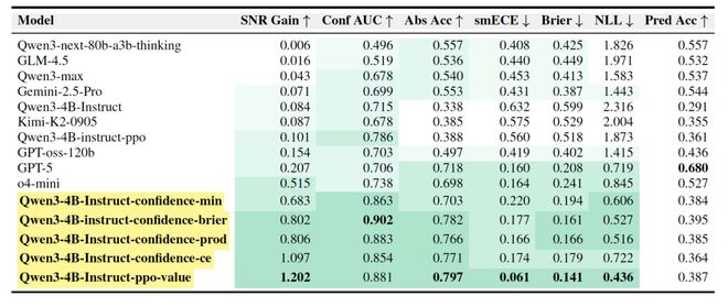 在BeyondAIME的响应级评估中,采用言语化置信度方法的40亿参数模型在SNR增益上显著优于GPT-5等其他模型。此外,Critic价值函数策略也显示出了较好的效果。